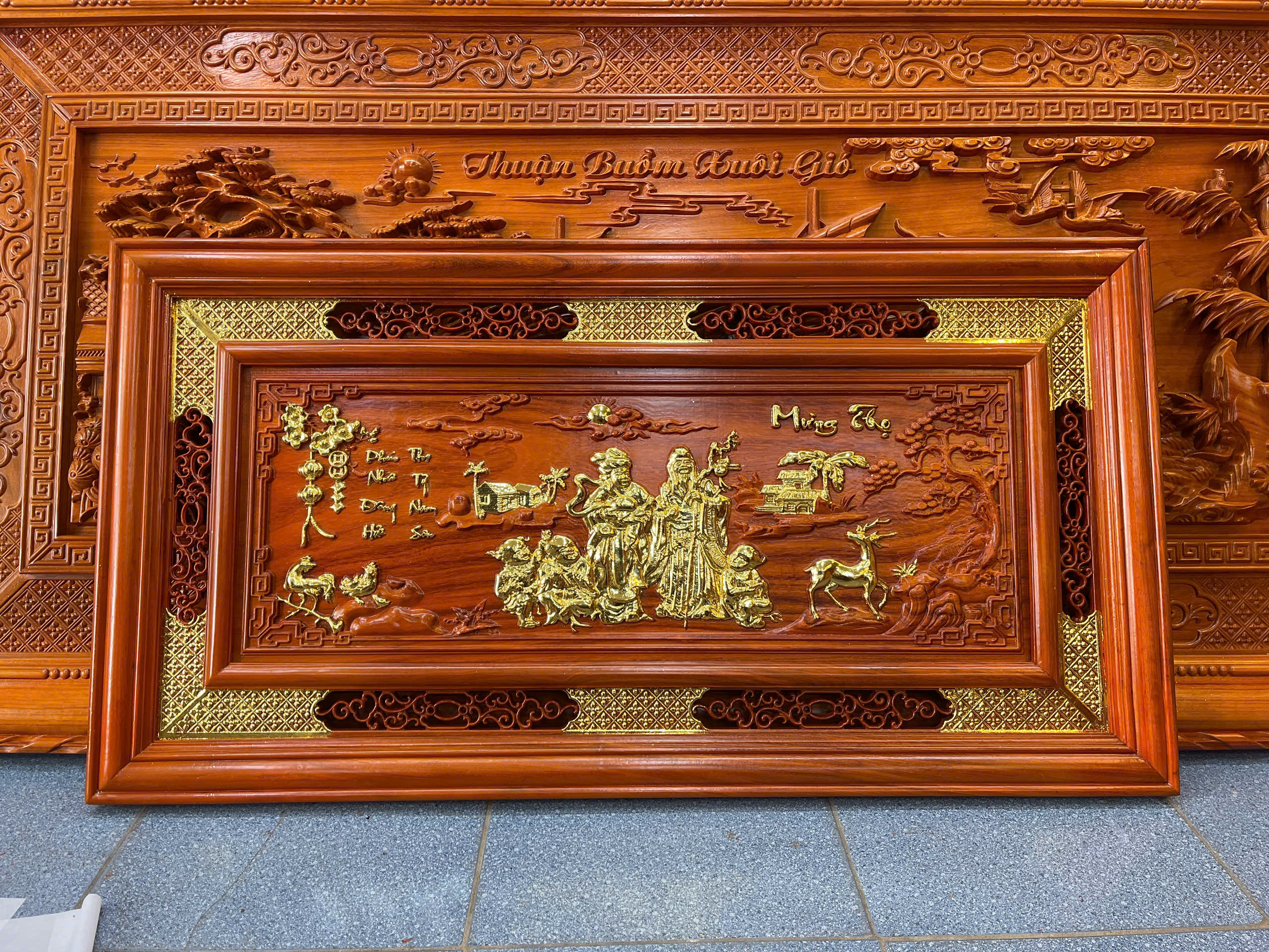 Toàn bộ hoa văn, chữ “Thọ”, họa tiết chim hạc, hoa lá… được đục nổi thủ công 100%, tạo chiều sâu và sự sống động cho bức tranh. Mỗi đường nét đều thể hiện tay nghề cao của nghệ nhân, mang giá trị nghệ thuật vượt trội so với tranh CNC thông thường.